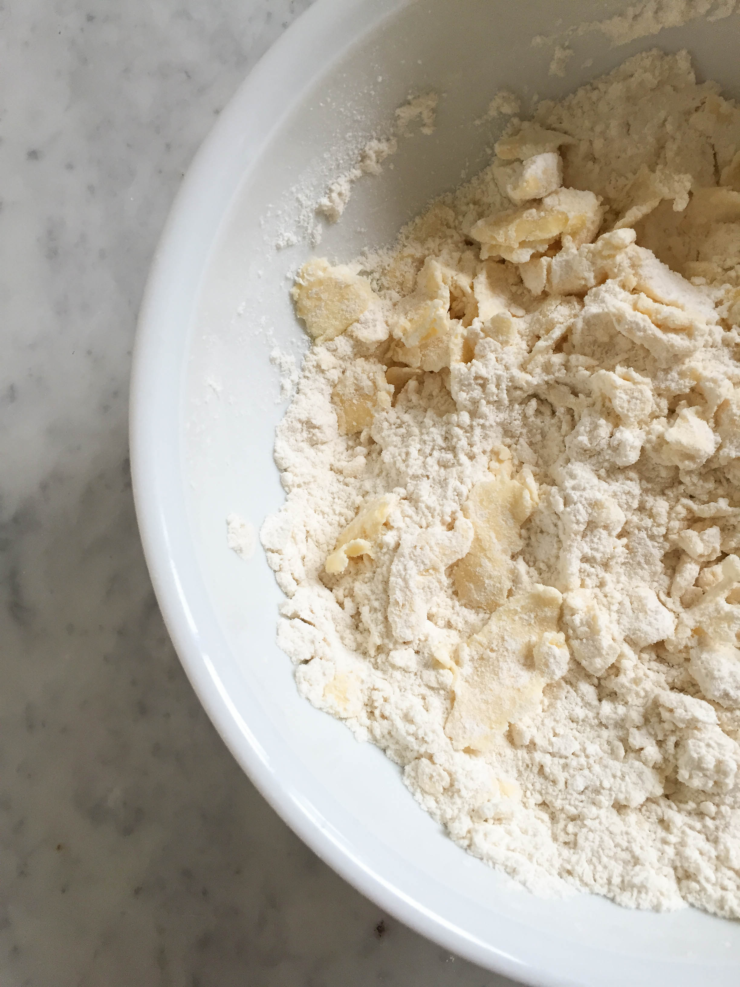 - Place the flour in a large bowl. Cut the butter into large cubes (about a cubic inch in size) and pinch off large, thin butter flakes using your fingertips, until all the cubes have been turned into flakes.