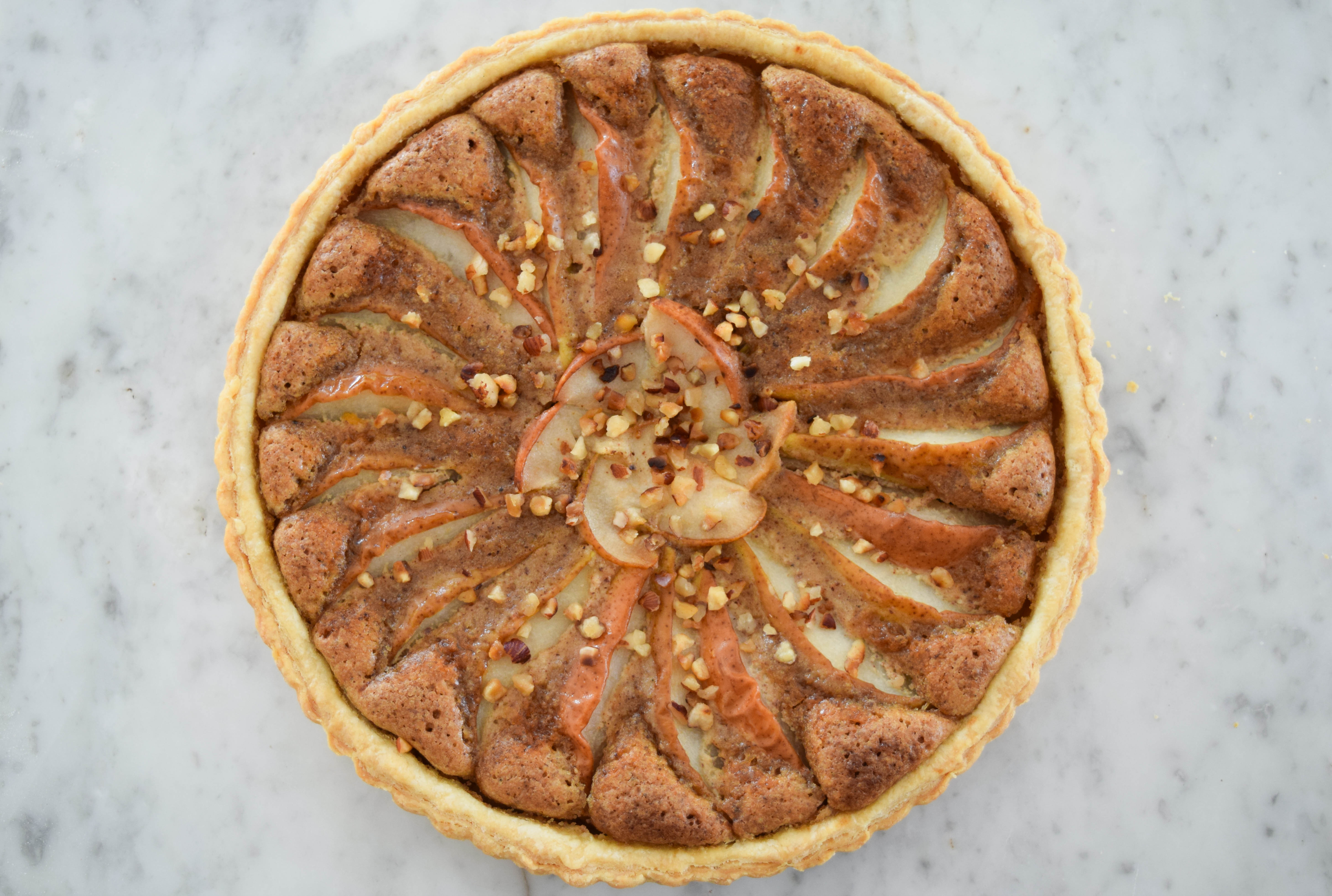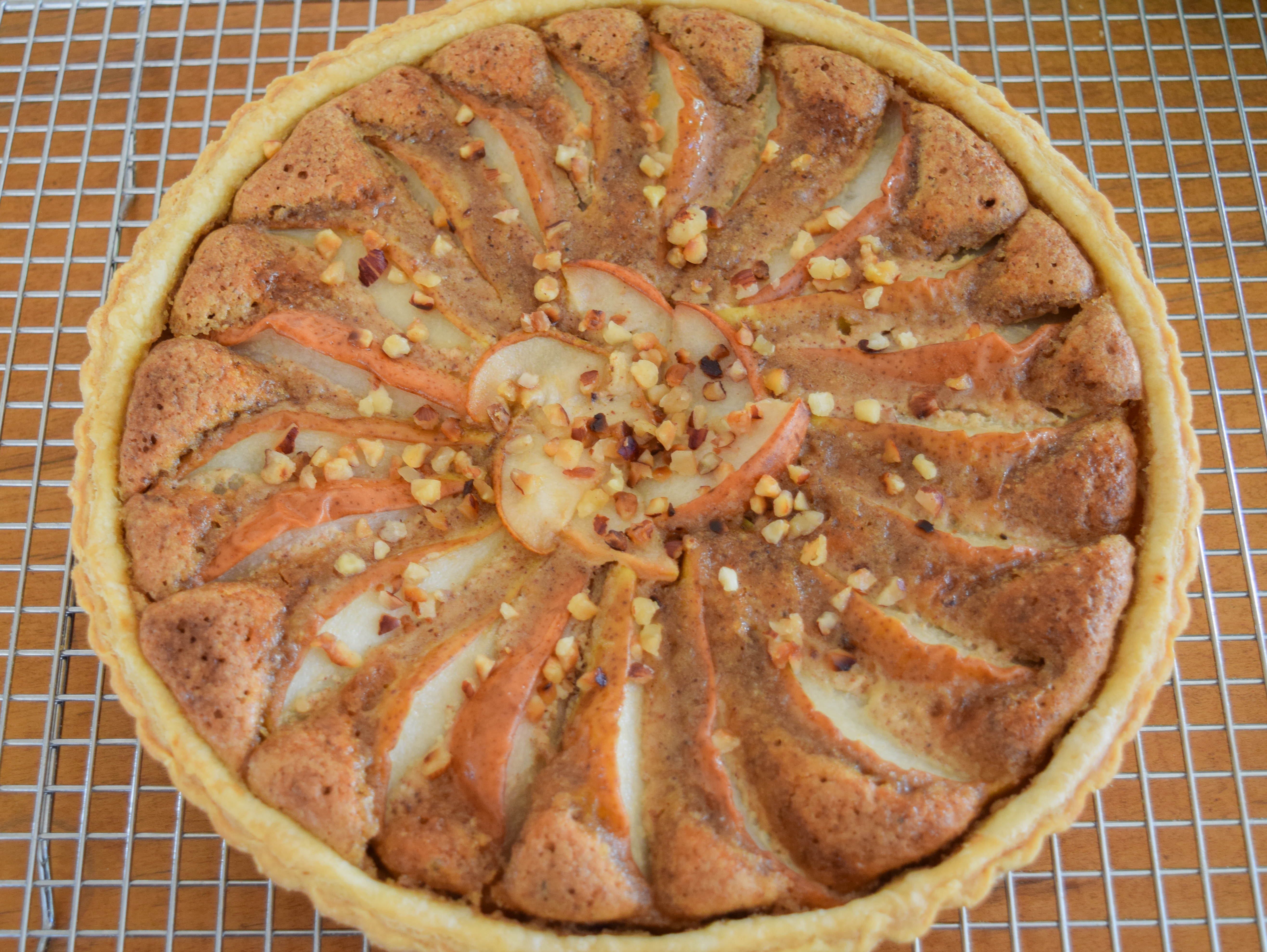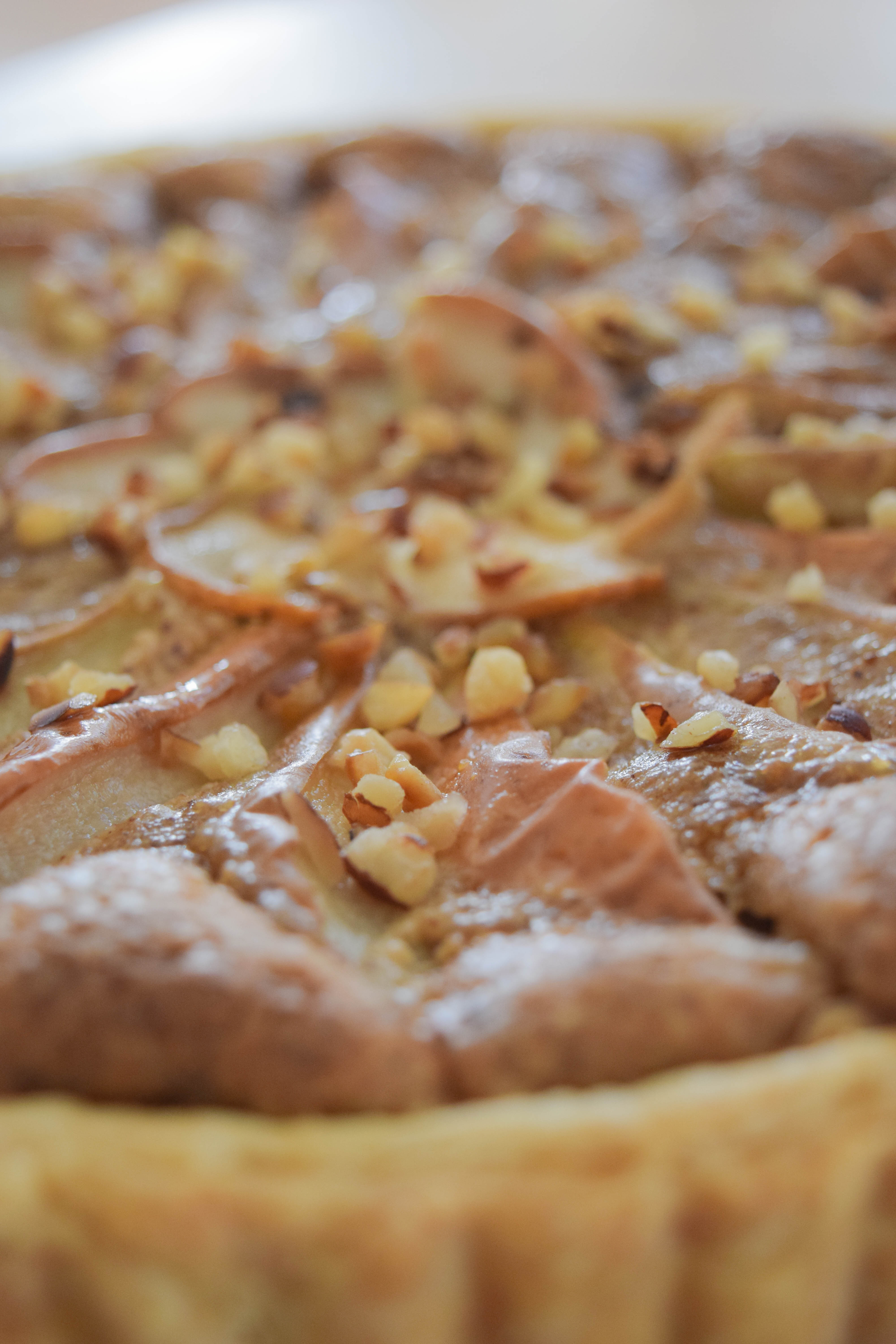 - When the tart is done, remove it from the oven and immediately brush the pears with apricot jam to give them a beautiful sheen. Sprinkle with the remaining chopped hazelnuts.