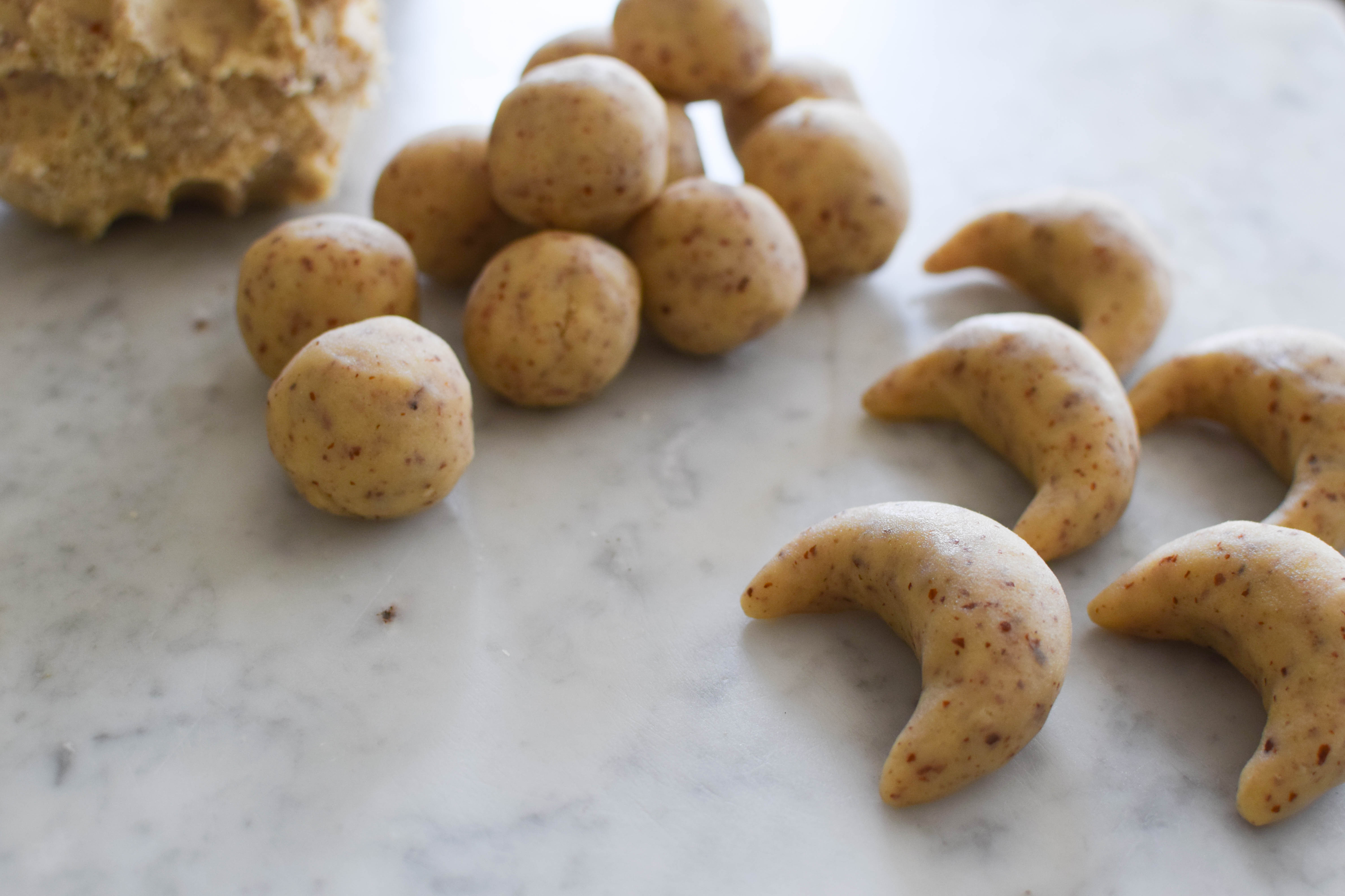 - Pinch off walnut sized dough balls, roll balls into sausages and bend them into crescents.