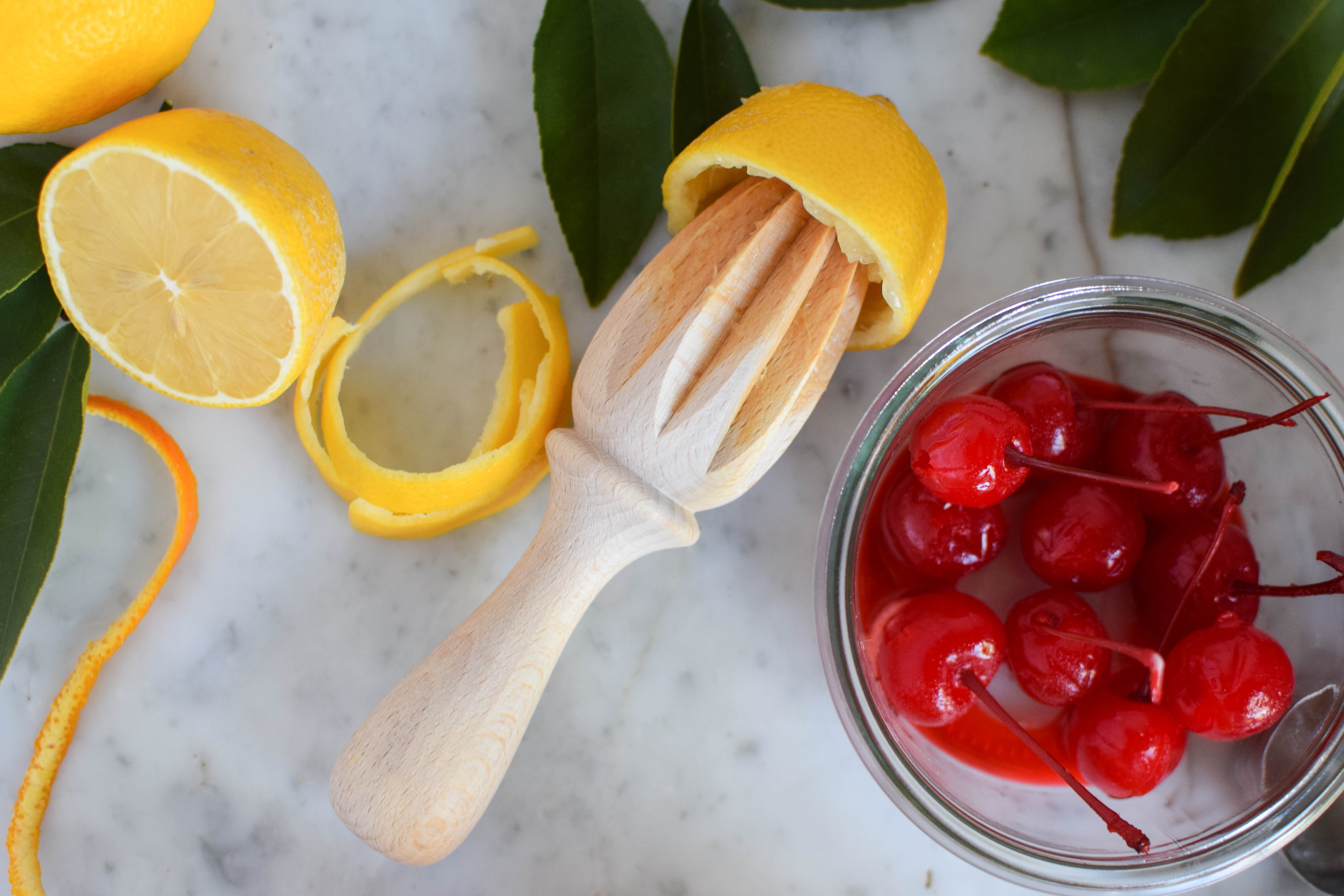 - Garnish with a Maraschino cherry and orange or lemon zest or a half orange slice.
