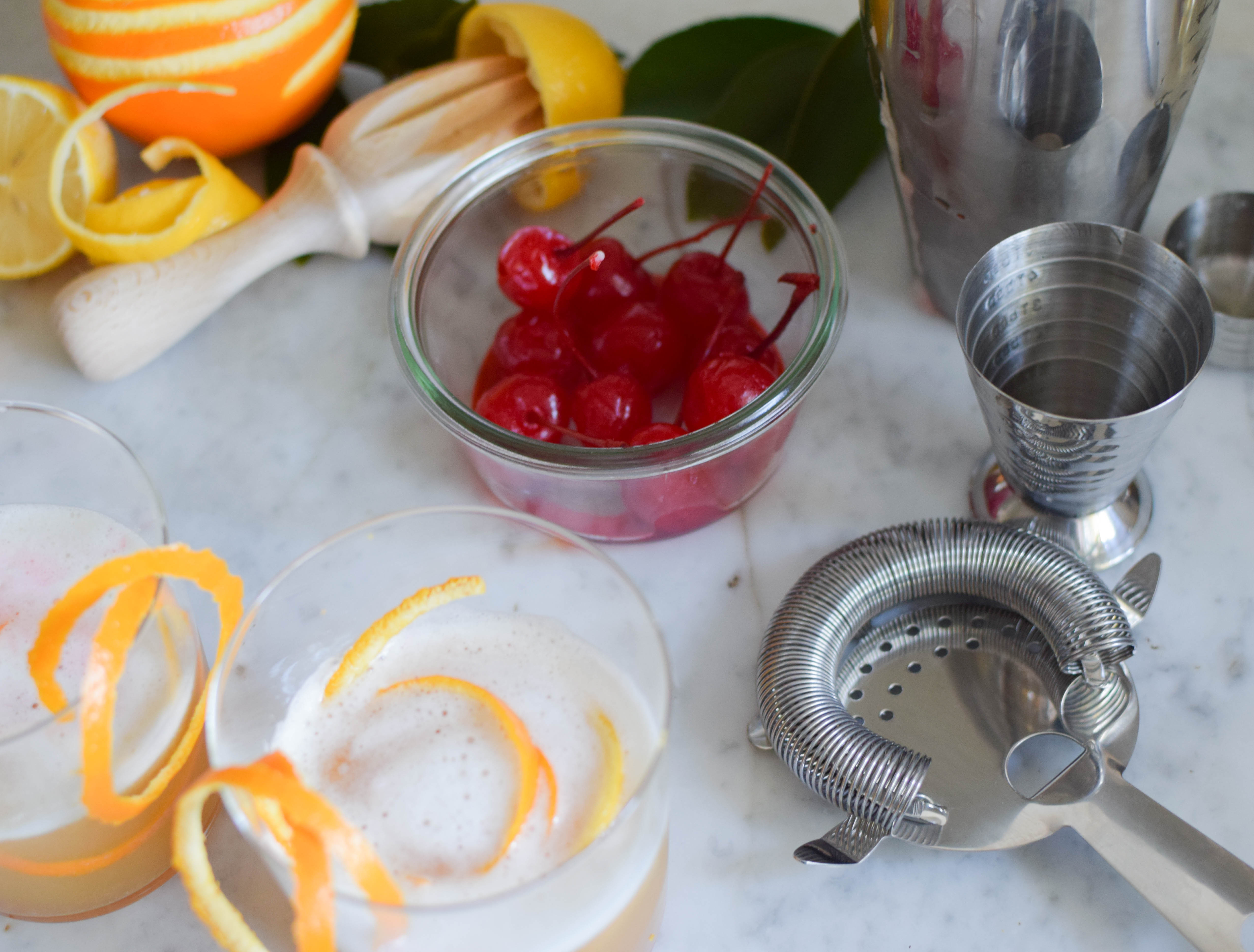 - Combine whiskey, citrus juice, simple syrup, and egg white. Shake with ice.