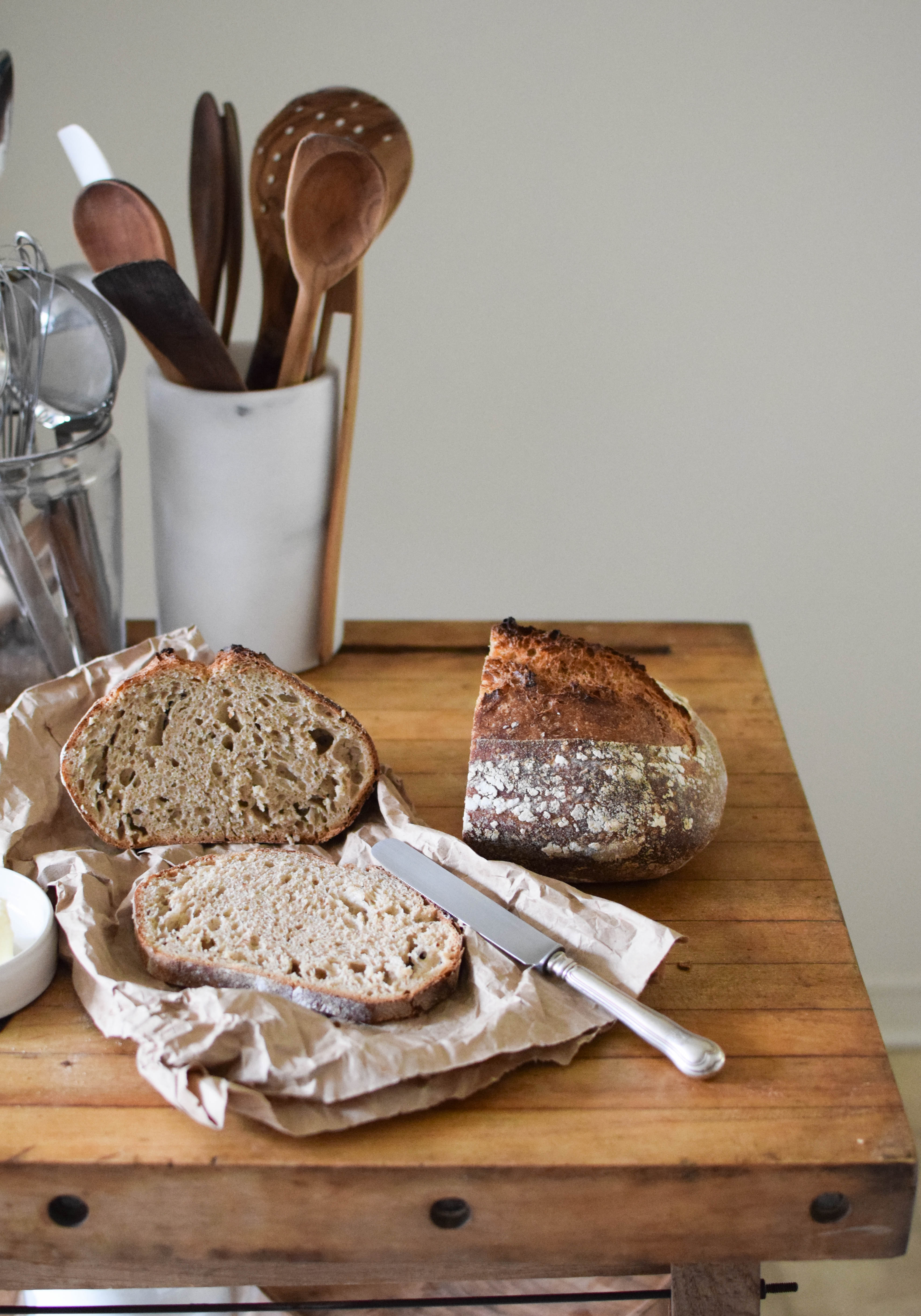If you read my posts about homemade baguettes and pretzel buns, you already know a couple of tricks to help you succeed. For the recipe below, the loaf is baked in a pre-heated cast-iron Dutch oven or a clay baker, which eliminates the need to saturate your oven with steam. The other reason why this bread is great for first-time bakers is that it does not require any kneading.