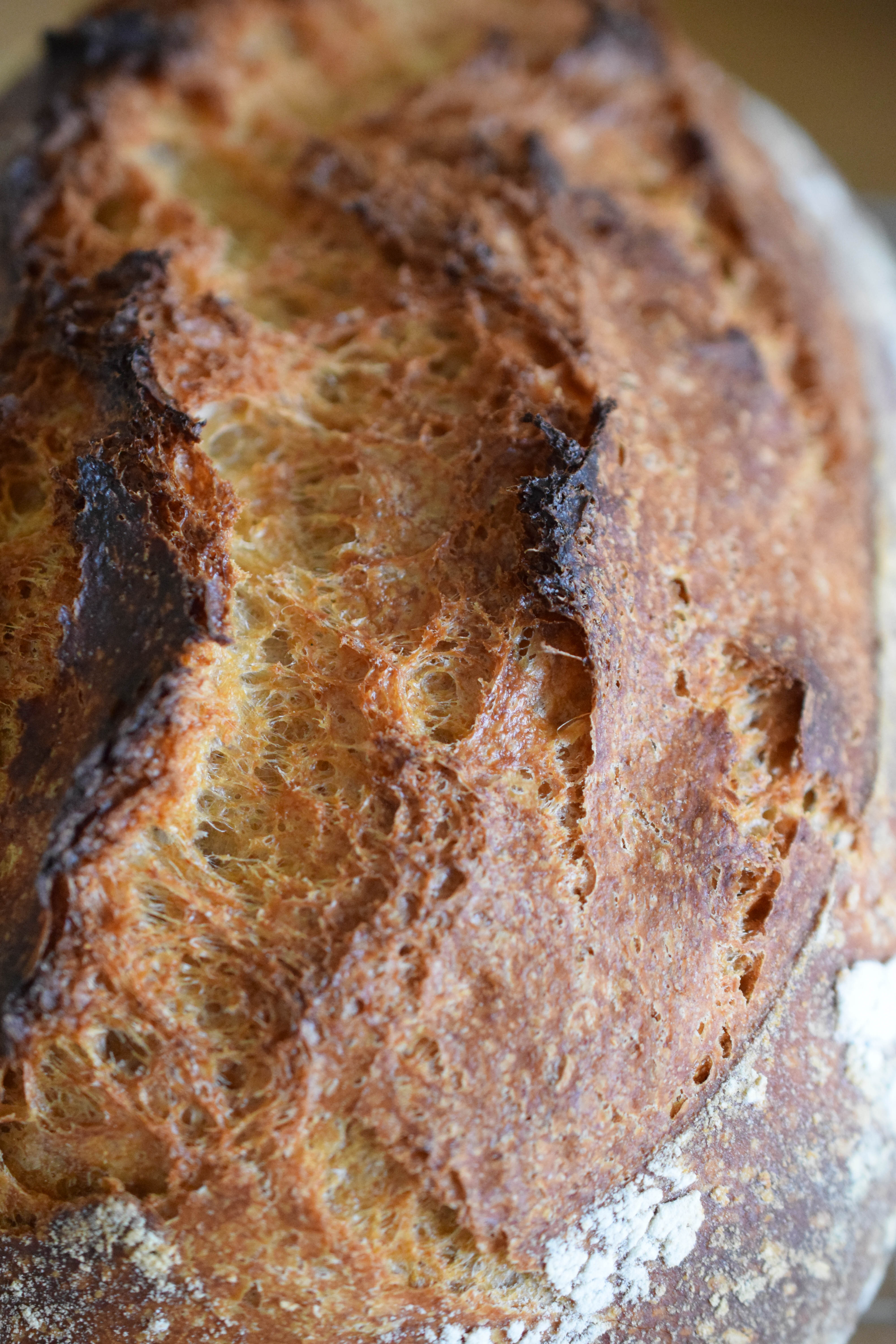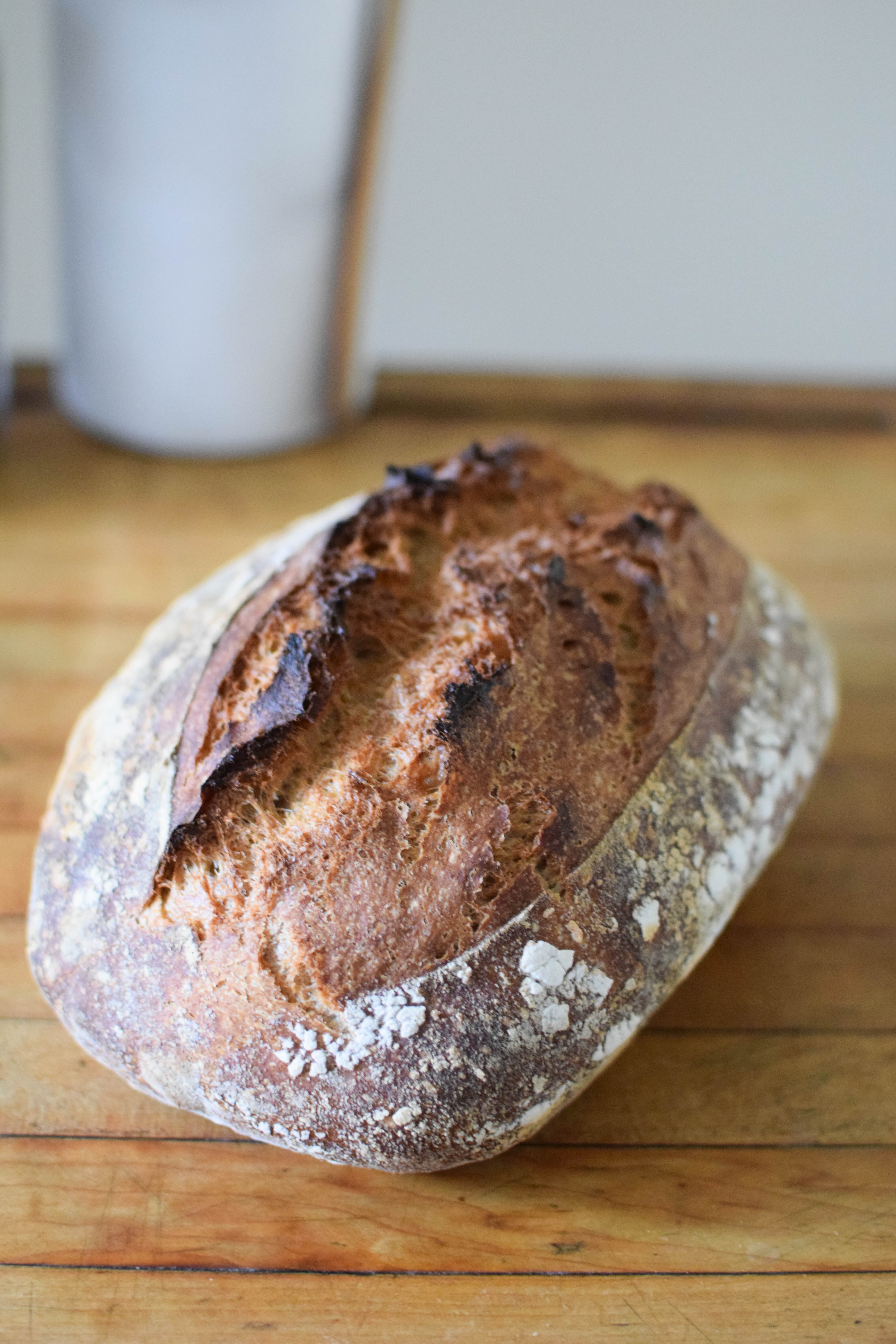 The recipe is based on Jim Lahey’s no-knead bread as published in NYT Cooking, which makes a lovely rustic loaf with an irregular open crumb. I wanted to add more flavor and decided to use 40% whole wheat flour (more on baker’s percentages below), which meant that I had to adjust the process and formula slightly to make sure I still get the beautiful rustic loaf I was looking for.