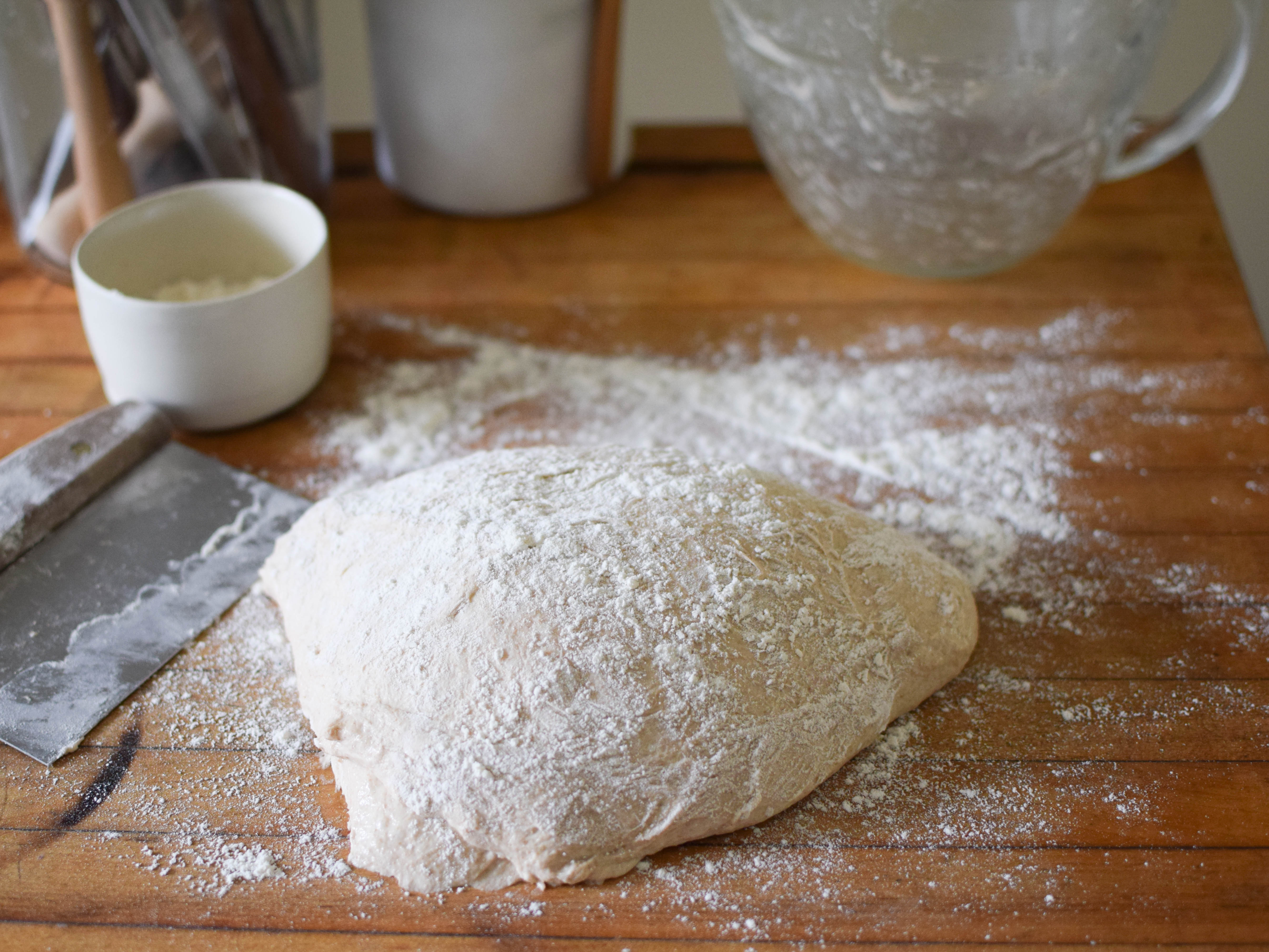 - Transfer dough to lightly floured counter top and fold it over on itself. Sprinkle with flour and lightly cover with plastic wrap to keep a skin from forming. Let rest for 20 minutes.