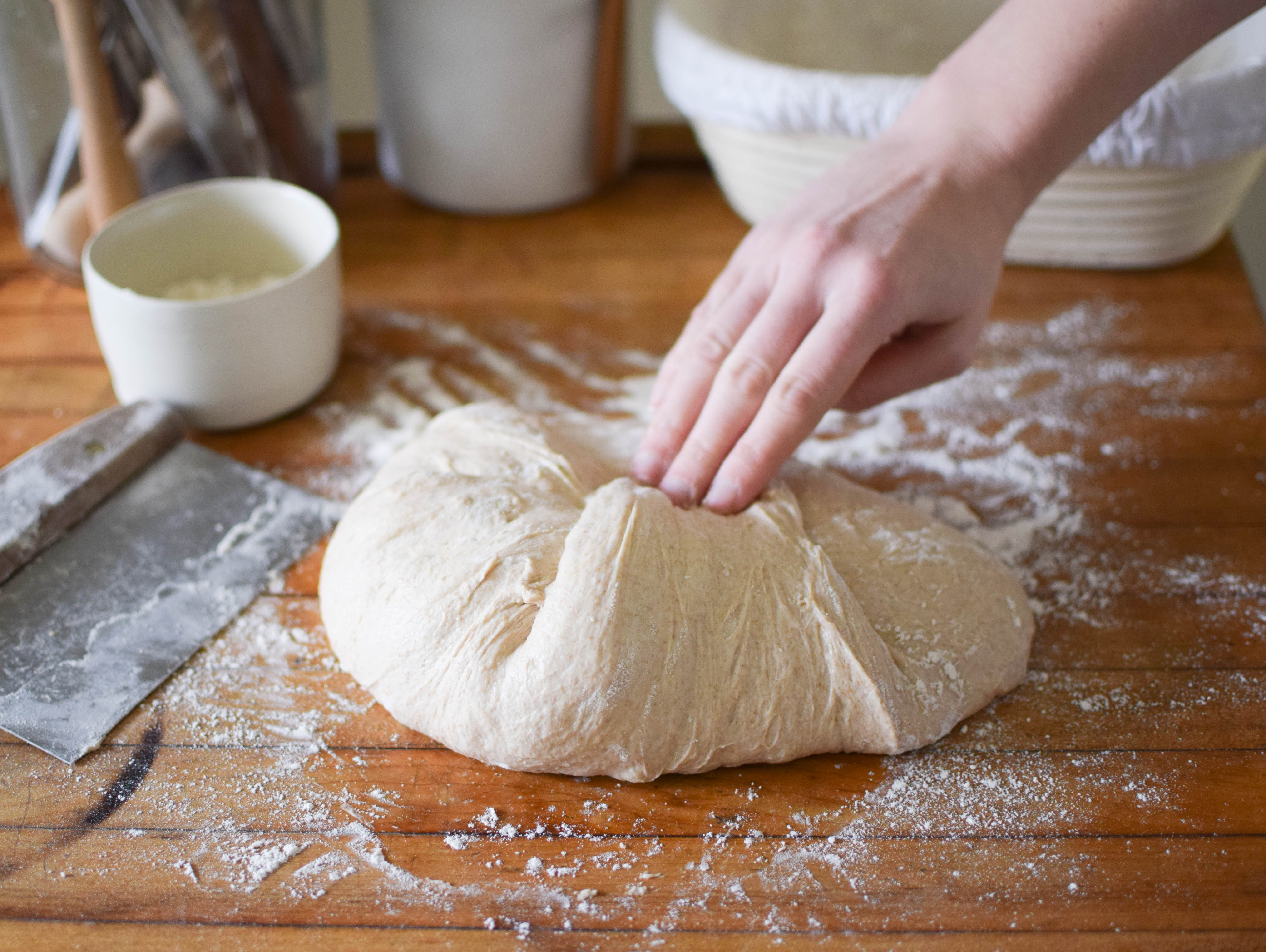 Using whole-wheat automatically means that the dough will contain less gluten. I decided to add eight “turns” (stretching the dough and folding it over on itself) during the bulk fermentation stage to make up for this lack of gluten and to develop the existing gluten better. The stretching and folding is almost like super slow-motion kneading, without all the elbow grease.