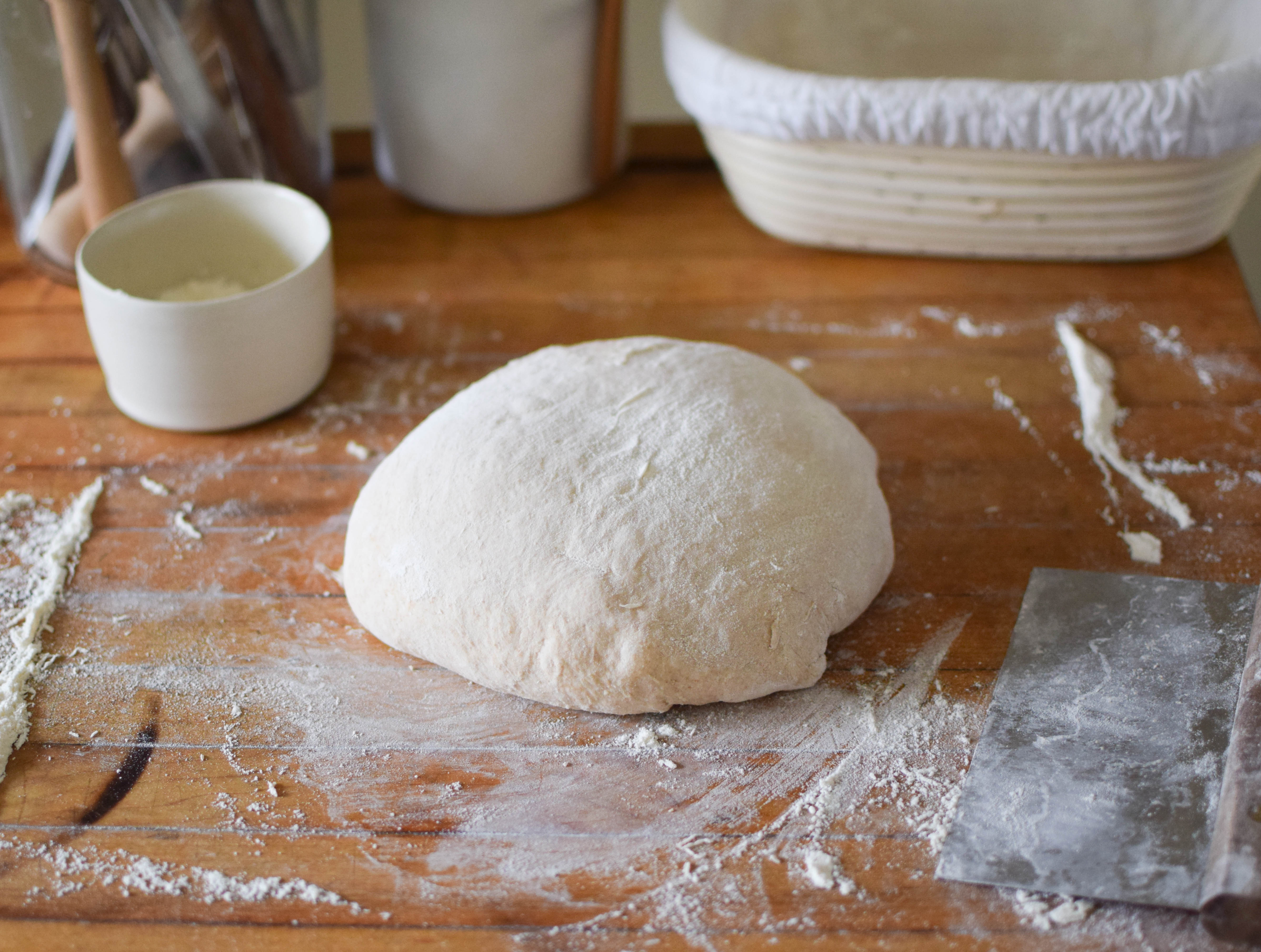 This means that you start out by mixing the dough, letting it ferment at room temperature (70-72°F) for four hours, and stretching and folding it every 30 minutes. After the four hours, you transfer the dough to a lightly floured work surface, fold it over onto itself, and let it rest for 20 minutes to allow the gluten to relax.